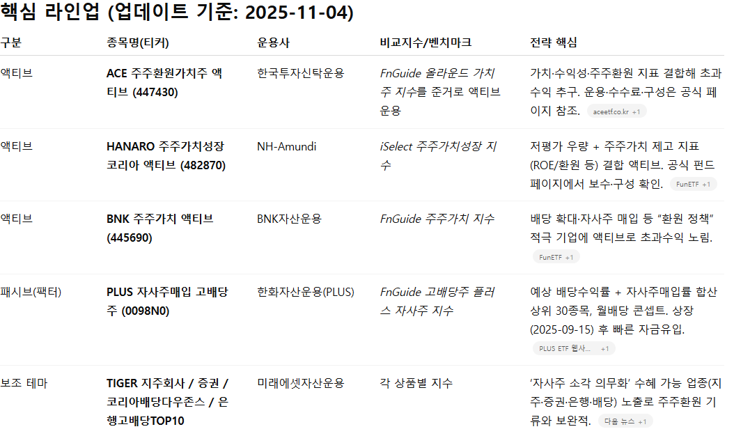 주주환원 ETF는 자사주 매입·소각 + 배당정책 + 주가 저평가까지 포괄합니다.