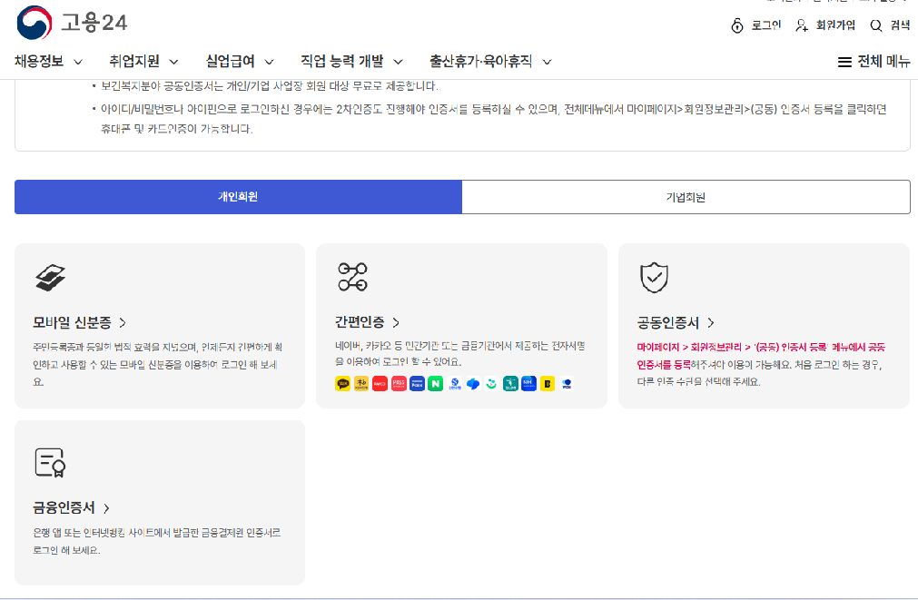 또는 고용24(m.work24.go.kr)에서 회원가입 후 로그인합니다.