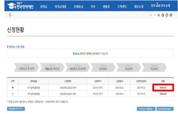 이 경로에서 본인의 국가장학금 상태가 표시됩니다.