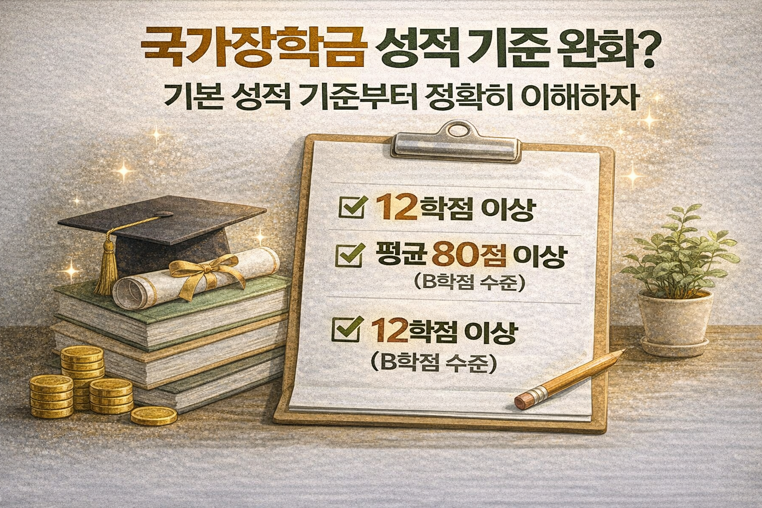 | A. 기본 기준은 다음과 같습니다. ✔ 직전 학기 12학점 이상 이수 ✔ 평균 80점 이상(B학점 수준) → 단, 소득구간·대상자 유형에 따라 일부 완화됩니다. |