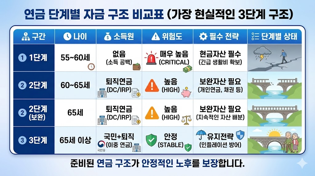 | 2단계 | 60~65 | 퇴직연금 | 높음 | 보완자산 필요 |
