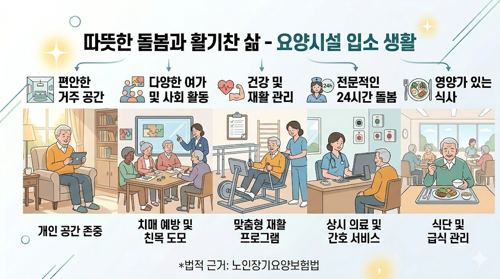 시설급여는 요양원 등 장기요양기관에 입소하여 24시간 돌봄 체계를 받는 방식입니다.