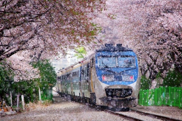철길 양옆으로 벚꽃 나무가 늘어서 있어