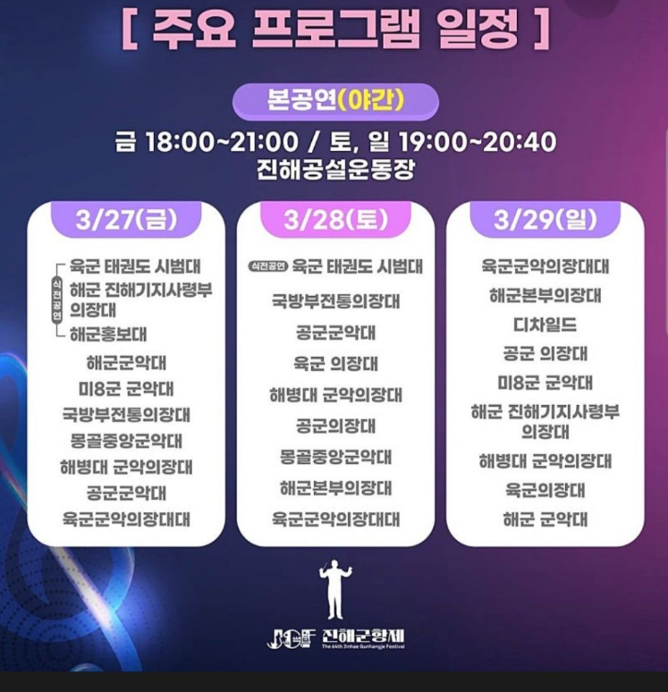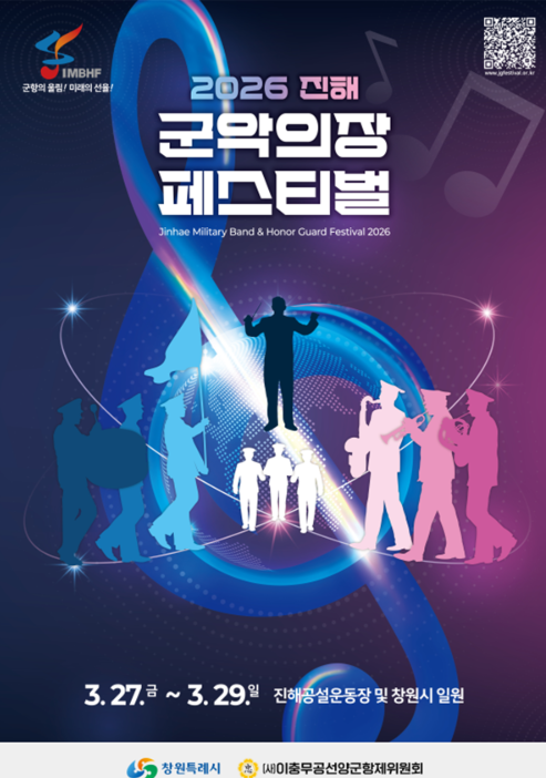2026 진해군악의장페스티벌은 2026년 3월 27일부터 29일까지 3일간 진행됩니다. 장소는 진해공설운동장 및 창원시 일원이며, 군항 도시 특성을 살린 대규모 퍼레이드가 펼쳐집니다. 슬로건은 “군항의 울림! 미래의 선율!”로 군악대 공연 중심 축제입니다.