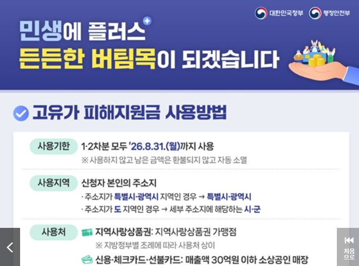 특히 이번 제도는 단순 현금성 지원이 아니라 지역사랑상품권, 신용·체크카드, 선불카드 등으로 받아 주소지 관할 지역 내에서 사용하도록 설계돼 지역 소상공인 소비 활성화까지 함께 노리고 있습니다. 신청 기간과 사용 기한이 정해져 있으므로, 대상자라면 늦지 않게 확인하는 것이 중요합니다.