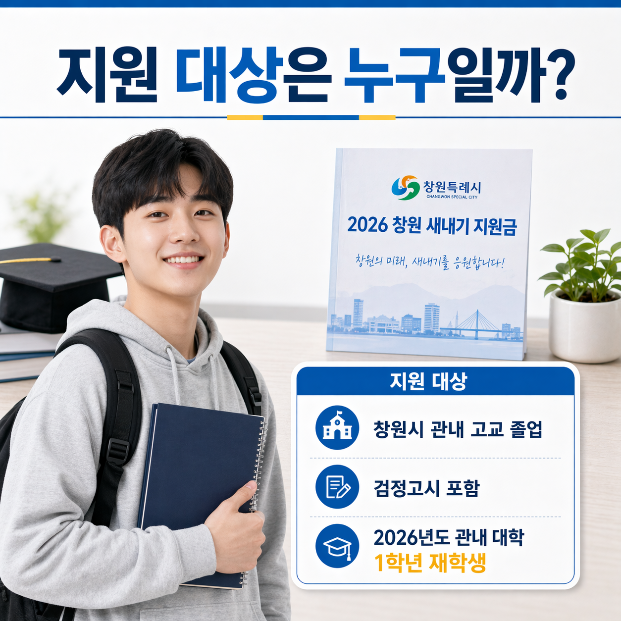 지원대상: 창원시 관내 고교 졸업자(검정고시 포함) + 2026년 창원시 관내 대학 1학년 재학생
