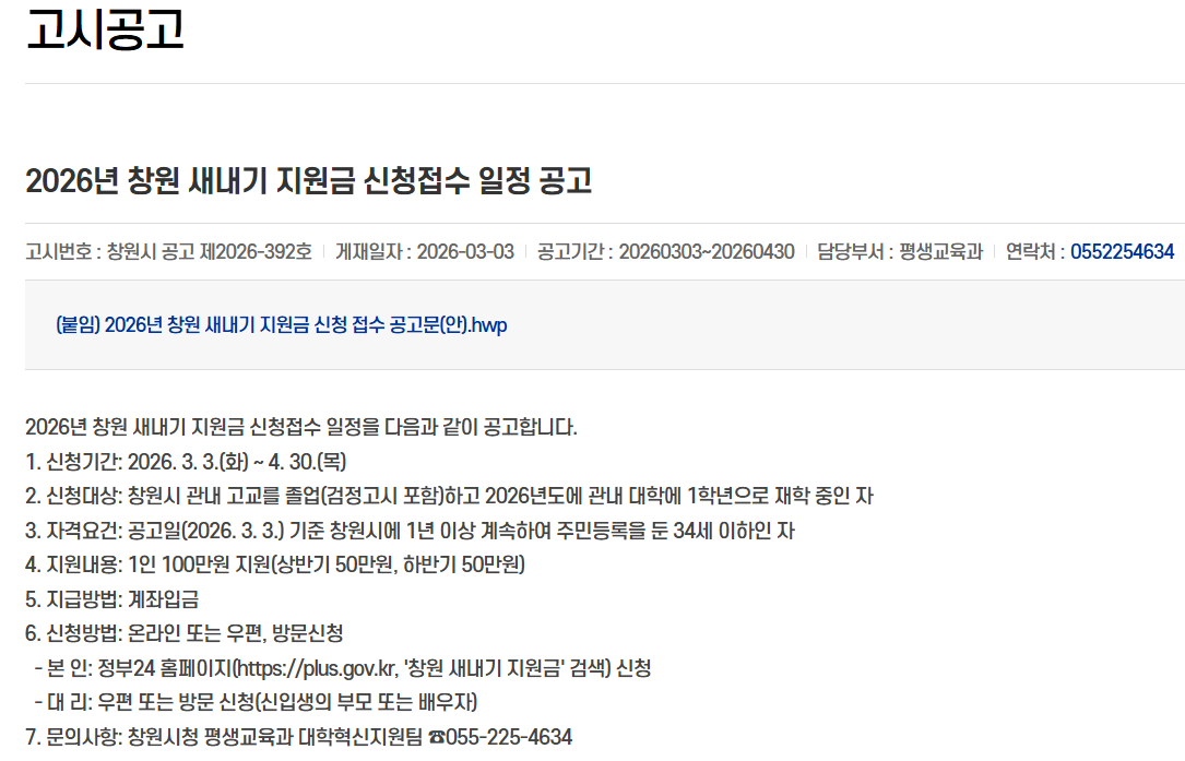2026 창원 새내기 지원금은 창원시가 지역 대학 신입생의 학업 정착을 지원하기 위해 운영하는 제도입니다.
