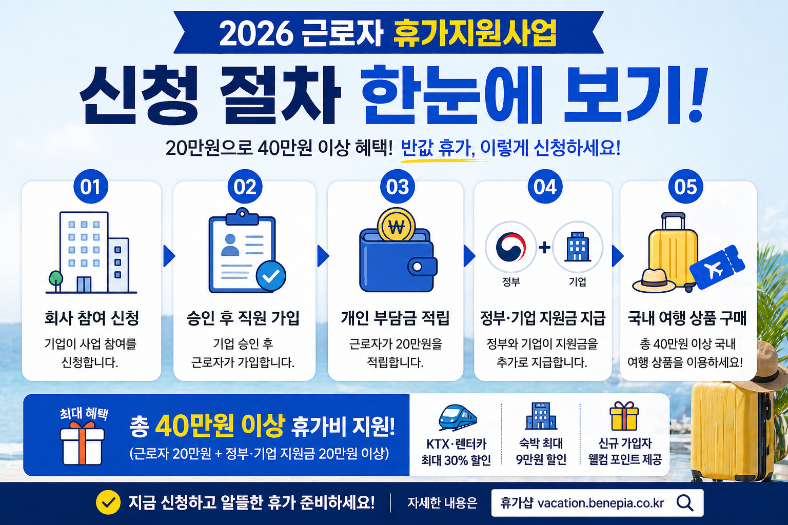 쉽게 말해 20만 원 내고 40만 원 이상 쓰는 휴가 제도라서 ‘반값 휴가’라고 불립니다.